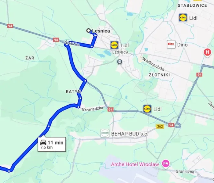 – 5 km do granicy Wrocławia- obwodnica Leśnicy